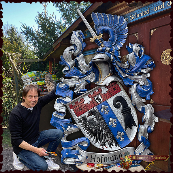 Unter anderem hat er sich auf das Gestalten, Schnitzen und fassen von Wappen aller Art spezialisiert. Seine Wappen sind mit Liebe zum Detail kunstvoll von Meisterhand geschnitzt. Er fertigt jedes Wappen in jeder Art und gewünschten Größe und bereichert somit seine adeligen Kunden die bürgerlichen Familien von Heute über die Zeit hinaus mit einem sichtbaren Zeichen. Ein Zeichen für Familie und Zusammenhalt vererbbar von Generation zu Generation, denn ein Wappen ist wie ein wertvolles Dokument.