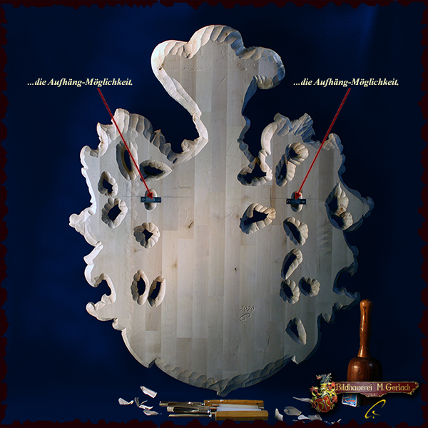 ......die Kanten der Wappen-Rückseite wird auch herunter geschnitzt, damit das Wappen später an der Wand leicht und nicht klobig aussieht. ....außerdem schnitze ich in die Rückseite die Aufhänge-Möglichkeit ein und graviere die Jahreszahl der Entstehung und mein Zeichen ein.