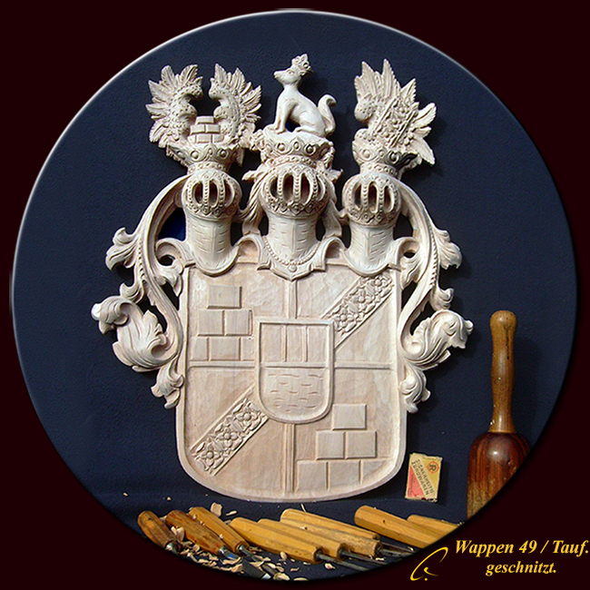 Unter anderem hat er sich auf das Gestalten, Schnitzen und fassen von Wappen aller Art spezialisiert. Seine Wappen sind mit Liebe zum Detail kunstvoll von Meisterhand geschnitzt. Er fertigt jedes Wappen in jeder Art und gewünschten Größe und bereichert somit seine adeligen Kunden die bürgerlichen Familien von Heute über die Zeit hinaus mit einem sichtbaren Zeichen. Ein Zeichen für Familie und Zusammenhalt vererbbar von Generation zu Generation, denn ein Wappen ist wie ein wertvolles Dokument.